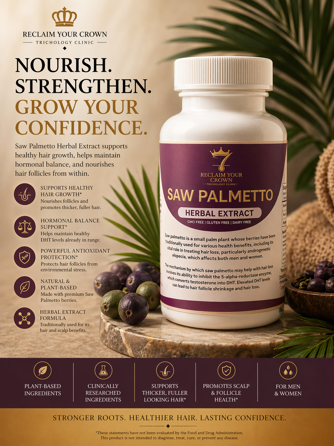 Saw Palmetto is a small palm plant whose berries have been traditionally used for various health benefits, including its vital role in treating hair loss, particularly androgenetic alopecia, which affects both men and women.